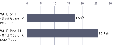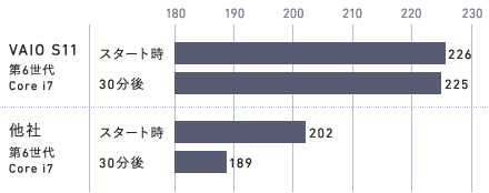 VAIO S11はこれほどのコンパクトボディにもかかわらず、13~15型の高性能ノートPCと同じ、第6世代インテル® Core™ プロセッサー Uプロセッサー・ライン搭載。"いざと言う時"だけでなく、スリープからの立ち上がりなど日常のあらゆる操作をきびきびと快速にこなしてくれます。また、最上位機VAIO Zで培った放熱設計を惜しげもなく投入することで、CPUが内部温度上昇を検知して低速モードに切りかわってしまうということが起こりにくい設計を実現。ただ速いだけでなく、その速さがずっと続く。我々はそれこそが「真の」ハイパフォーマンスだと考えています。