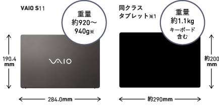VAIO S11は、そのコンパクトサイズも「快」の1つ。ビジネスバッグはもちろん、浅めのトートバッグや小さめのハンドバッグなどにも余裕で収まります。また、重量も剛性を保ちつつ、約920~940g※の軽量ボディを実現。ビジネスパーソンに求められるフットワークを阻害しないことにこだわりました。
