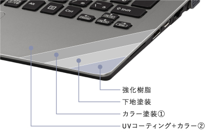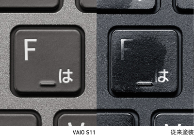 PCを長く使っていると、どうしても徐々に外装がダメージを受け、少しずつ傷ついていきます。それはあたかも、痛んだスーツで仕事をしているようなものです。そこでVAIO S11はすべての塗装面にUVコーティングを施すことで傷が付きにくいようにしています。特に、キートップには、専用開発したフッ素含有UV硬化塗装を使用。防汚性、耐指紋性を強化し、摩耗と皮脂油によるテカリを防ぎます。その上で、多層塗装で深い色合いを追求した3色カラーリングをラインアップ。堅く引き締まったブラック、シャープな印象のシルバー、柔らかな印象を与えるホワイトから選べます。