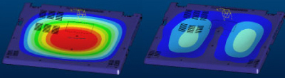 ビスレイアウト最適化前(左)では筐体が大きく変位し、セット剛性への影響も大きくなります。そこでVAIO S11ではバランスのよいビスレイアウト(右)で応力を分散し、変位を大幅に改善しています。