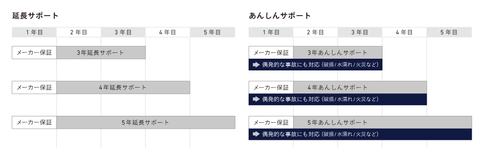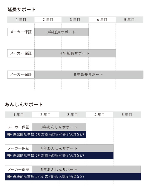 メーカー保証(1年間)の修理規定に準じた長期保証やオンサイトサポートに加え、偶発的な事故に対応するあんしんサポートもご用意しています。