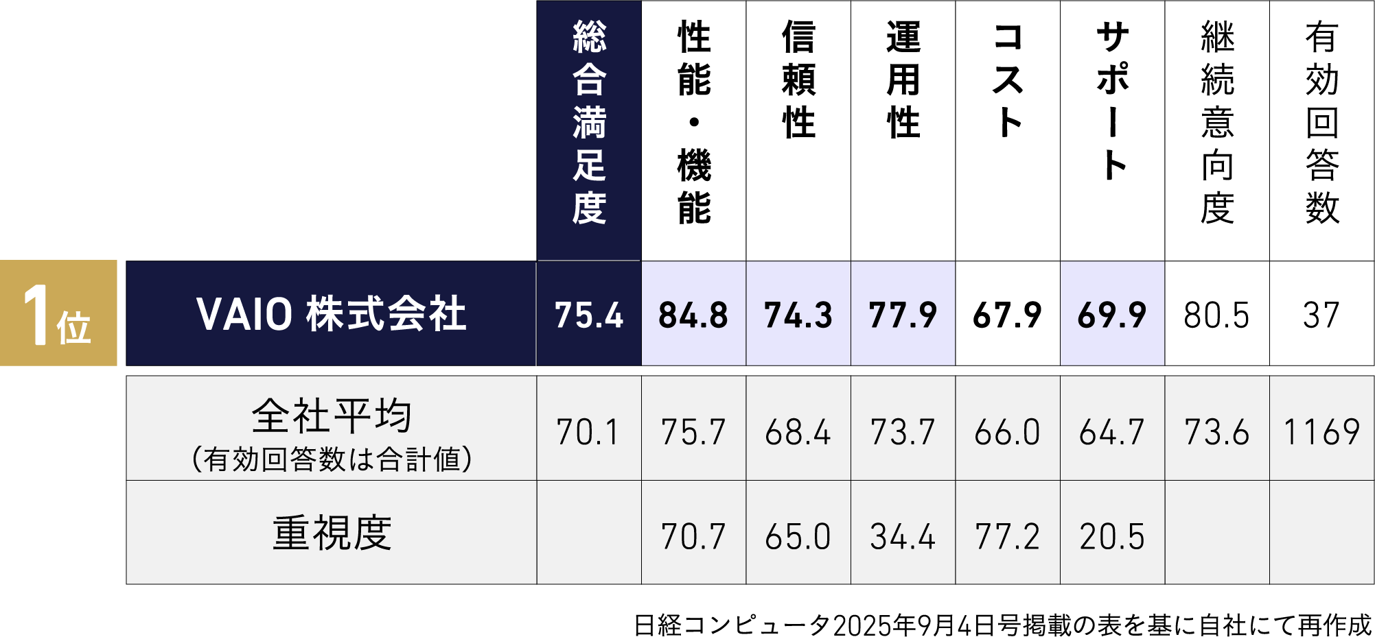 VAIOは全5評価項目中、「性能・機能」、「信頼性」、「運用性」、「サポート」の4項目で高い評価をいただき、総合満足度1位となりました。